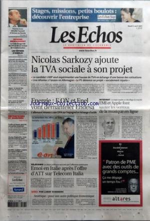ECHOS (LES) [No 19891] du 03/04/2007 - NICOLAS SARKOZY AJOUTE LA TVA SOCIALE A SON PROJET - LE CANDIDAT UMP VEUT EXPRIMENTER UNE HAUSSE DE TVA EN ECHANGE D'UNE BAISSE DES COTISATIONS - UNE REFORME A L'OEUVRE EN Allemagne - LE PS DENONCE UN PROJET SOCIALEMENT INJUSTE - PATRICK KRON DETAILLE L'ACCORD D'ALSTOM EN RUSSIE - DOSSIER MANAGEMENT - LA CROIX-ROUGE FAIT DES RH UN DE SES LEVIERS DE TRANSFORMATION - LES OFFRES D'EMPLOI - LAMANDA NOMME A LA TETE DE LA COUR DE CASSATION - ACCORD COMME PDF Kindle